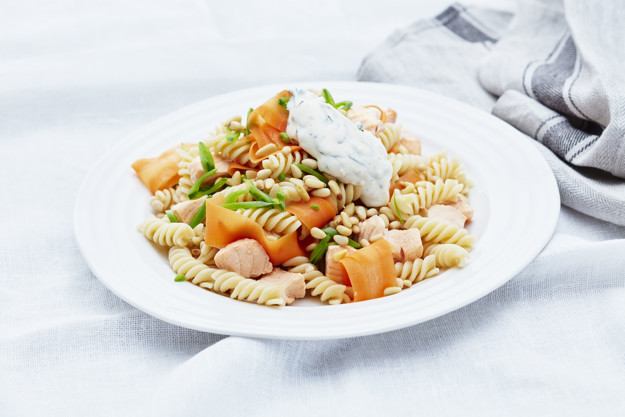 Hvit pasta med laks og Drømmelett-dressing